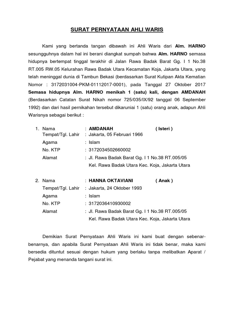 Tanda tangan asli para pemberi kuasa dan yang diberi kuasa. Sebelum membahas mengenai bagaimana bentuk dari surat keterangan ahli waris ini, alangkah baiknya jika para pembaca mengetahui terlebih dahulu beberapa dokumen yang harus dilengkapi untuk mengurus surat ini. Contoh surat jual beli tanah yang benar beserta pasal. Contoh surat hak ahli waris. Begini manfaat dan cara pengurusannya untuk menghindari kerugian.